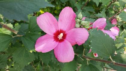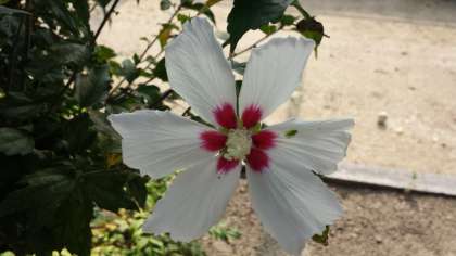 今回紹介の花は、ムクゲの紅白です。正門をくぐって右の花壇に咲きほこっています。