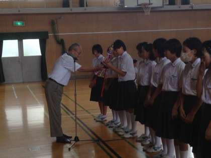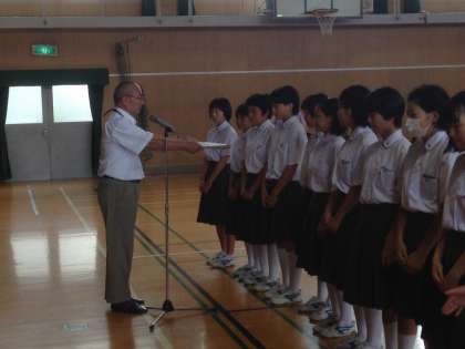 部活動で表彰された時には、月曜日の全校集会で表彰状の伝達式をしています。これから多くの成果が見込まれています。三年生は、最後の夏です。少しでも多くみんなと部活動に励むように一試合一試合がんばりましょう。