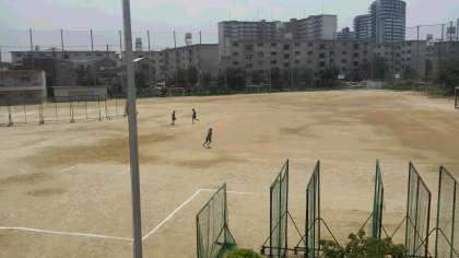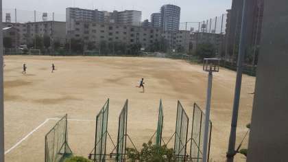 新トレーニング研究中、野球部の先生がノックをします。陸上部の生徒は、ボールを受け取りダッシュでバッターの先生のもとへ届ける。今日は、部員三人で練習をしました。楽しい練習の中、あいさつはきちんとできました。