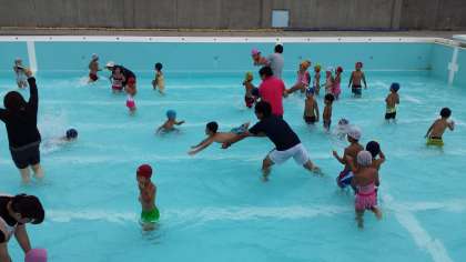 中学校の若手の先生もとても楽しく園児と遊びました。中学生と違って笑顔だらけでした。