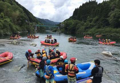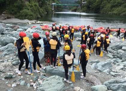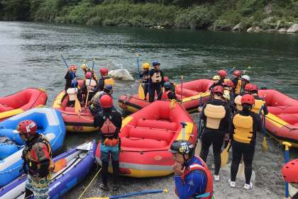 ライフジャケット、ヘルメットの最終チェックを行って、いよいよラフティングのスタートです。