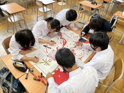 1年生では放課後の時間を活用して体育大会に向けて学級旗の制作を行っています。