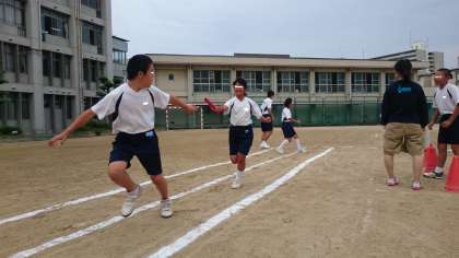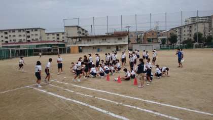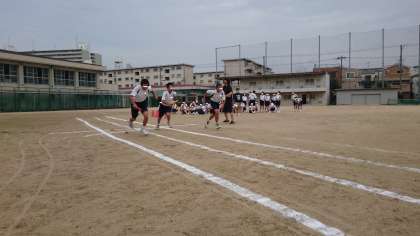 学年種目「全員リレー」を練習しました。50m〜200mまでのさまざまの距離をクラス全員でバトンをつないで走ります!