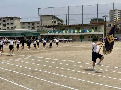 体育大会当日は、ナップサックにお弁当、水筒、タオル、レジャーシート、帽子、各係やクラブ行進時に必要なものを入れて登校となります。