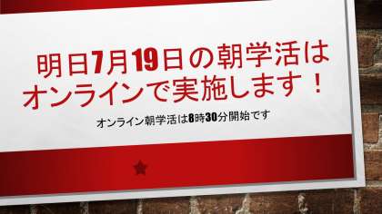 明日7月19日(水)は終業式の日となっておりますが、朝学活はご自宅でタブレットを活用したオンライン朝学活を実施します。