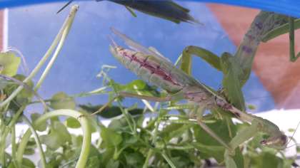 雄のカマキリが一匹だけ一週間前から虫かごにいました。今朝男子生徒が雌のカマキリを持ってきてくれました。お腹がすいていたのかバッタを二匹食べてその後は、雄のカマキリも食べられました。残念、数分後にかごの中を見てたらなんと…