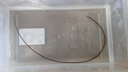 25センチあるハリガネムシが雄の体の中にいたようです。ネットで調べたら長いもので1メートルくらいのものもいるようです。中学校のカマキリ博士曰く、ハリガネムシは、水辺にいてトンボのやごやボウフラに食べられるのを待ちます。そして、カマキリのお腹を宿にしてカマキリがとった餌を体内で食べる。また、カマキリの脳を支配して水辺に向かっていくのです。ふしぎですね。