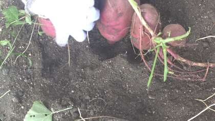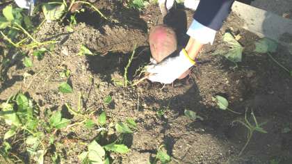 19日1限目に特別支援学級の代表で芋ほりをしました。いろんな形、大きさも様々なぜこんなに違いがあるのだろう。土の質、肥料の差、太陽の日の当たりいろんな条件が重なり違いができるのか。一番は、育て方かもしれませんね。草とり、水やり毎日の観察がとても大事でした。