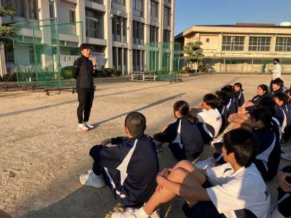 講話の後、グラウンドにてランニング講習をしていただきました。