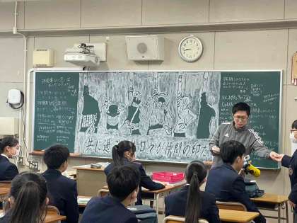 担任の先生が昨日夜遅くまで残って描いた黒板アートにも歓声が上がっていました。
