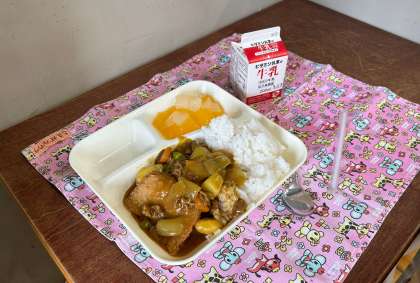 今日から給食が始まりました。今年度最初の献立はカツカレーとフルーツポンチでした。