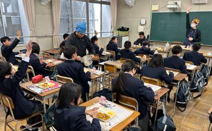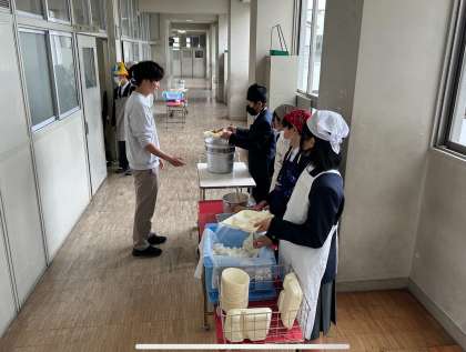 一年生にとっては中学校での最初の給食でした。神戸配膳の仕方など小学校の時と勝手が違うようで、少し時間が掛かっていろ様子でした。写真は一年の配膳と食事前の学級の様子です。