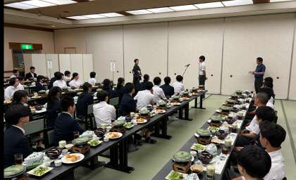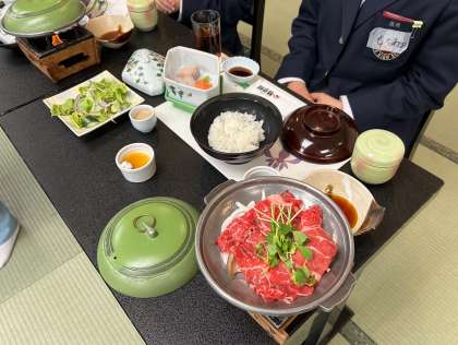 ホテルの女将さんにご挨拶をして、早速豪華な夕食です。写真のメニューに加え、エビフライや唐揚げ、讃岐うどんも食卓に並びました。