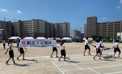 生徒会会長を先頭に、生徒会旗、70周年記念横断幕を持って、素晴らしい行進を披露してくれました。