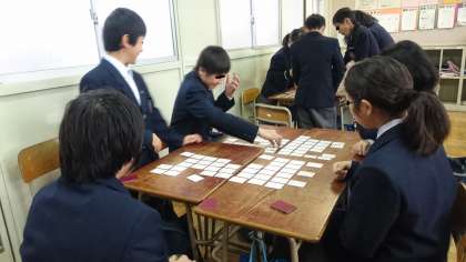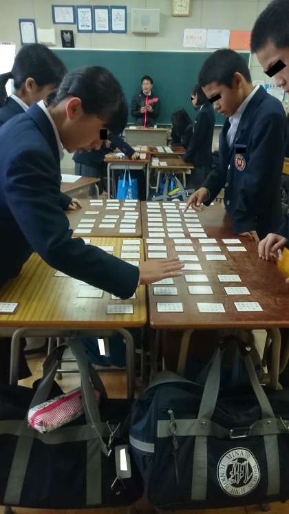 取り札を取る生徒や懸命に探しながら取る生徒など楽しんで取り組んでいました!