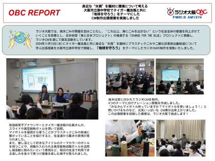 先日の11月13日(水)に1年生の学年で実施しました探求学習(ラジオ大阪さんとタイガー魔法瓶さんを招いての授業)で制作しました「地球を守ろう」をテーマにしたCMが明日の11月23日(土)のラジオ大阪主催のイベント「OBFラジオまつり ふれあい広場2024」の中で活用されることになりましたのでお知らせします。