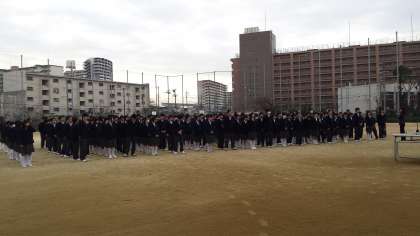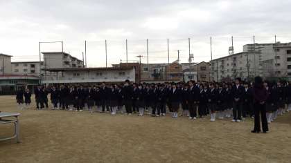 体育館が二月いっぱい天井工事のため使用できません。初めての運動場での始業式を行いました。「ありがとう」についてどんな意味があるか、あることが難しい、奇跡のことめったにないほど素晴らしいもの、巡り会えた感謝を表すことばが「ありがとう」です。反対のことばは、「あたりまえ」ということ。三学期「ありがとう」のことばが自然と出るようになれば良いですね。皆さんを取り巻くあらゆる人は、この地域で一番元気である中学生の成長を期待してくれておりますそれぞれの持ち味を発揮して三学期もしっかり取り組みましょう