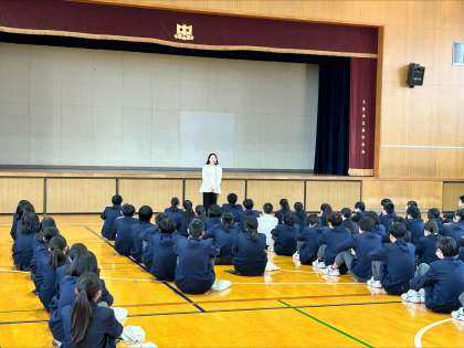 本日の全校集会にて、校長先生より、3学期から新しく家庭科の教科担当として、高橋先生が着任されるという連絡がありました。高橋先生からも挨拶があり、家庭科の授業のことなどを話していただきました。教室に戻ると、早く授業を受けたいと話す生徒も見られました。