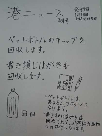 そこで今回の号外号にペットボトルキャップと書き損じはがきの回収のことについて書かれていました。