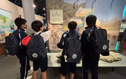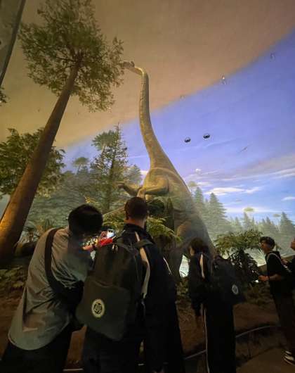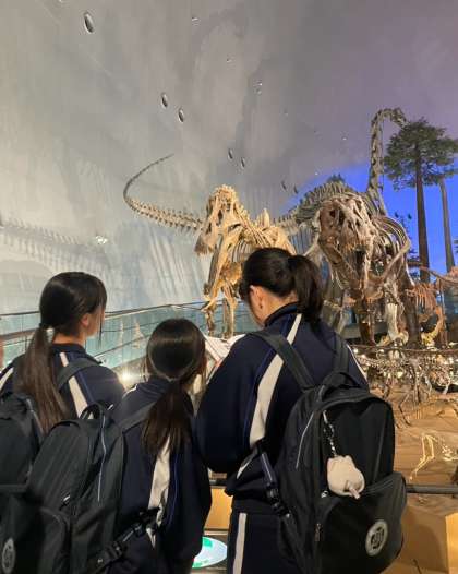 恐竜博物館の見学班は、勝山市に移動しました。大きな卵型のドームの中にある博物館のエスカレーターを降りると、ティラノサウルスがお出迎え。大きな空間に、所狭しと恐竜の骨格模型が展示されています。