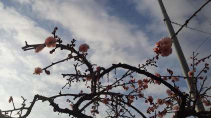 梅が開花しだして初めての晴れ模様です。うぐいすはまだ来ません。