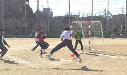 感動的な瞬間です。女子のコールが決まった瞬間。男子もゴールの目の前さて、ボールはその後どこに行ったでしょうか?ボールに人がいっぱい集まるとボールをしっかり蹴ることがとても難しいですね。焦れば焦るほど思うようにボールを蹴ることができません。しかし、練習で乗り越えることができます。がんばりましょう。