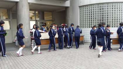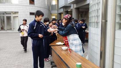 手洗いの後、礼儀正しく一列にPTAの方が丹精込めて作ってくださいました。心を込めて「いただきます」「ごつそうさまでした」