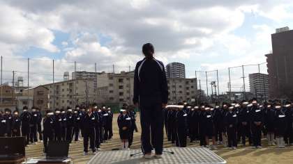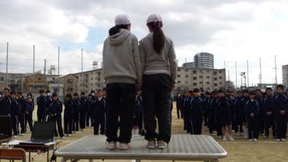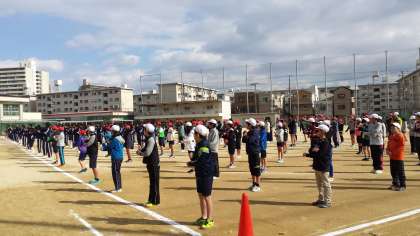開会式に続き準備運動を八幡屋、池島小学校六年生と港中学校一年生、二年生とで行いました。