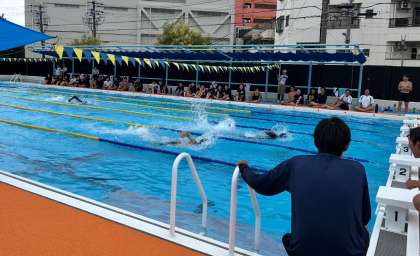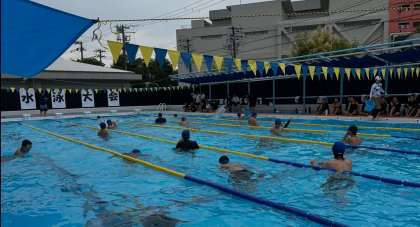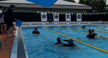 午前中、水泳大会後はにわか雨が降りましたが、水泳大会中は天気に恵まれ、最後まで競技を行うことができました。