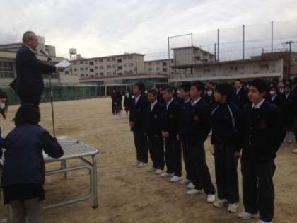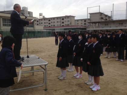 駅伝大会個人賞の授与式、一年生の部、学校の外周570メートルとグランドの大回り300メートルの870メートルにおいて1学年男女別に上位5人に賞状を授与しました。男子では、1位が同タイム2分44秒で2人受賞となりました。女子の1位は、2分58秒の好記録でした。全国的に見ても素晴らしい記録です。