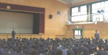 天井工事も完了して、LED照明器の放つ体育館で全校集会を行いました。初めに大阪市青少年指導員連絡協議会主催の絵画コンクールで、見事入選を果たした生徒(一年生)の表彰式を行いました。おめでとうございました。次に四年に一度来る「うるう年」の豆知識について、最後は、体育館使用時に体調の変化など気になることがあれば教師に伝えてください。(ペンキの臭いや照明がまぶしいなど)話をいたしました。