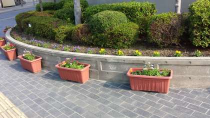 秋の花が正門をくぐるとプランター九つに色とりどりの花が咲き誇っています。