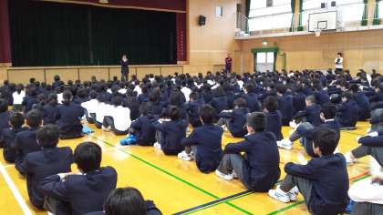 連休明け、雨のため体育館で集会をしました。生徒会の役員の方が数ヶ所(要所)に立ち生徒の皆さんを誘導していました。ご苦労様です。ありがとうございます。