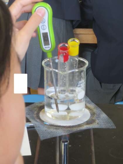 ガスバーナーを使い、2つの物質を熱していき、50度まで熱したときの2つの変化を観察しました。
