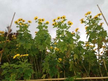 この時期なのに、公園の入口近くに、すごく背の高いヒマワリが咲いていました。「皇帝ひまわり」または「ガリバーヒマワリ」という種類のヒマワリだそうです。