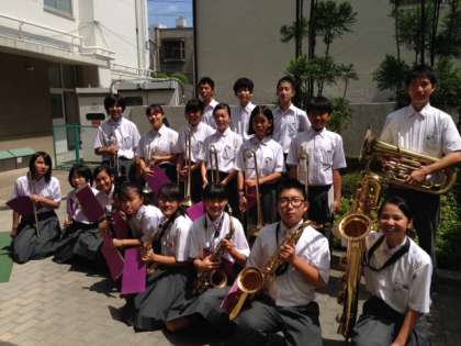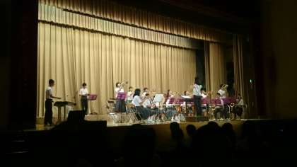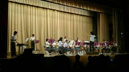 吹奏楽部が第3ブロック音楽会に参加しました。1曲目は『三日月』をしっとりと演奏。2曲目の『2015ベストヒット歌謡祭』は軽快なリズムで会場からの手拍子を誘い、動きのあるパフォーマンスで見せる演奏を楽しませてくれました。