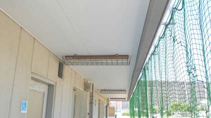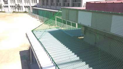 技術室、クラブ室、体育倉庫などの前面に防球ネットを取りつけました。また、体育倉庫の天井も新しくなりました。以前は、各種ボールが倉庫のガラスに当たって割れたり、天井に穴が開くなど破損が多かったです。ネットにもたれると伸びたりしますからネットにはもたれないようにしてください。