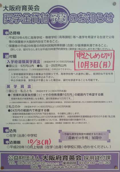 大阪府育英会 奨学金貸付(予約)…10/3(月)まで!