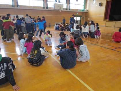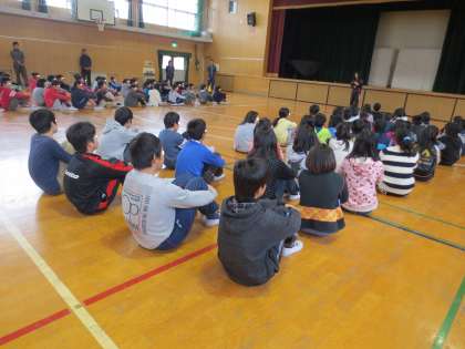 中学校に2校の小学生が登校後、体育館に集合しました。