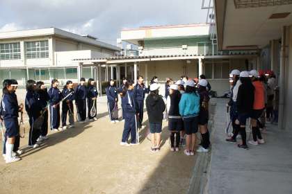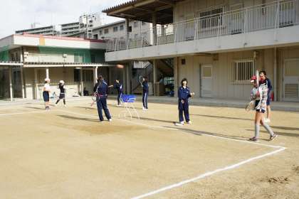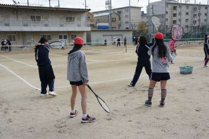 グランドで先輩たちがイチからやさしく・ていねいにラケットの持ち方や振り方などを教えてくれました。