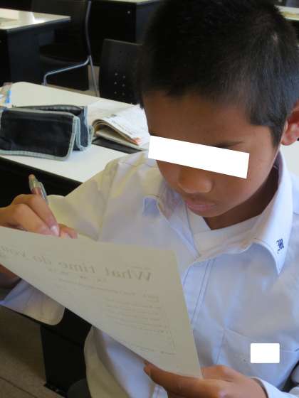 「What time 〜?」を使い、お友だちに「何時に起きるの?」「何時に学校へ行くの?」「何時に夕食を食べるの?」…などなど質問しました。
