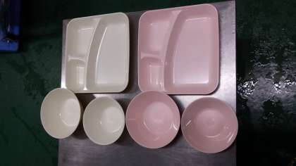 来年度から給食は、親子方式で全生徒が給食になります。八幡屋小学校で調理していただいたものをいただくことになりました。これで温かいおかずをいただくことになります。これから四月を迎えるに当たり、ご家庭で準備していただくものなどお知らせいたしますので、どうぞよろしくお願いいたします。たとえば、(エプロン、三角巾、マスクなど)写真の食器は、三つ切皿、中食器、小食器です。アレルギー対策としての食器は、右側で食器の色が変わります。
