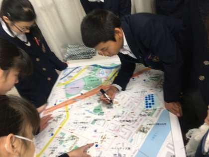 地図を使い、震災時における地域の強み、弱みを探り学習しました。