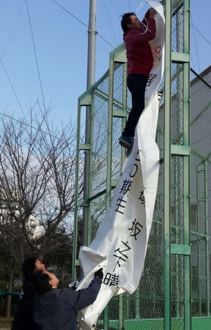 校舎に設置していました垂れ幕をバックネットに移動しました。理由は、強風に耐えられずヒモが切れるためです。