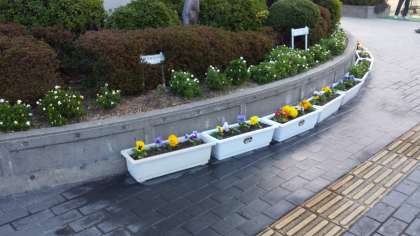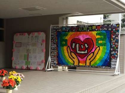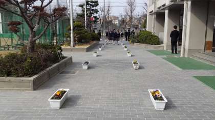 14日(火)晴天のもと厳粛に卒業式が行われました。式場入口には、折鶴アートの飾り付け、花道にはパンジーなどが卒業生を祝ってくれています。35個のプランターは、港会(元PTA役員、実行委員)の方と現在のPTA役員、実行委員の皆さんで準備をしていただきました。