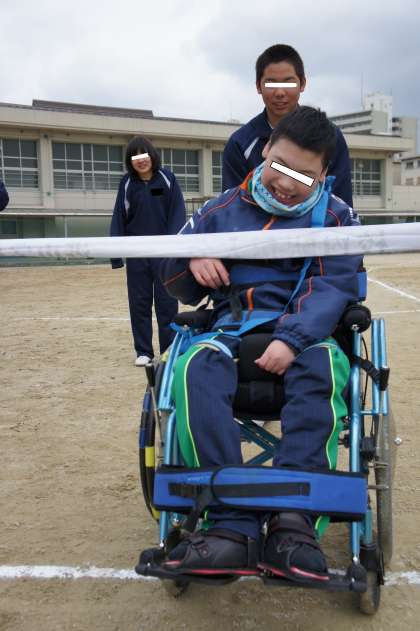 同じ学年の生徒からタスキを受け取り、自分の力で車イスをこいでゴールを目指しました。港中生からエールをもらいました!
