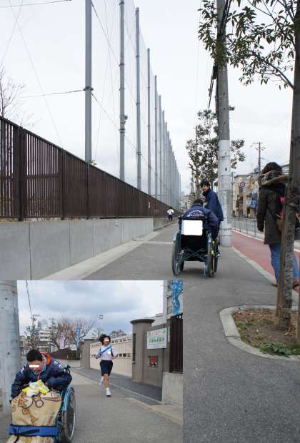 開会式後、交流生のペースで港中生と同じように駅伝コースを車イスで走りました。