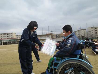なんと、2年生の体育委員たちが頑張って駅伝コースを1周した交流生に「完走賞」の「賞状」と「メダル」を贈りました。
