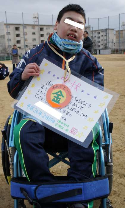 特別支援学校の先生や保護者の方に手伝ってもらう場面もありましたが、1人で頑張って車イスをこいで駅伝コースを1周しました!