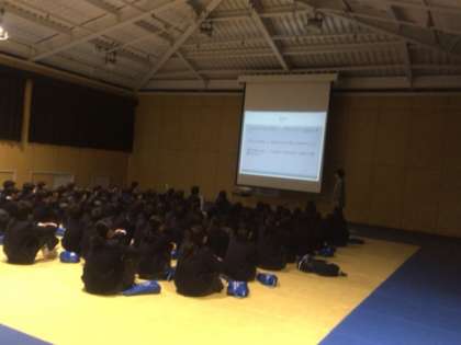 1年生一泊移住に向けて、映像を使い内容説明をおこないました。